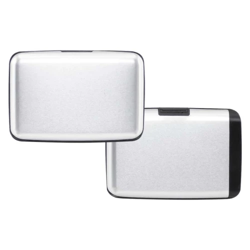Estuche rígido Porta-Tarjetas (tamaño Tarjeta de Crédito) con protección anti-clonación o Escaneo RFID. Capacidad interior para 6 Tarjetas. Incluye cargador de celular Power Bank de 2.500 mAh, con indicador de carga y cable USB/Micro USB. Presentación en bolsa de polipropileno y Estuche plateado de Regalo.