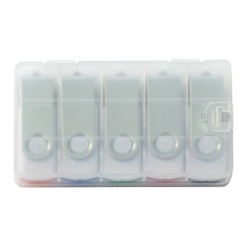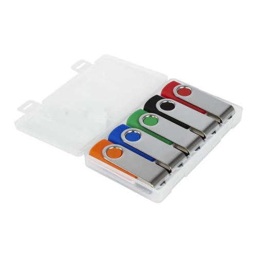 Set de 5 USB Pendrive 2.0 de 64GB de memoria cada Pendrive, con carcasa metálica de giro. Cada Pendrive tiene la particularidad de venir con cuerpo plástico bicolor: por un lado un color blanco común para todos los Pendrive, y por el otro, cuerpo de color con los colores clásicos de Promo Import. Presentación en Estuche de PVC translúcido de regalo