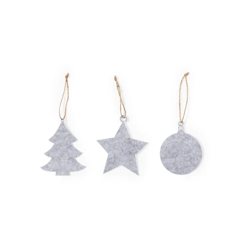 Set de adornos navideños de 3 piezas fabricadas en suave fieltro. Incluye en 3 diseños: Árbol de Navidad, Estrella y Bola Navideña. Todas las piezas incluyen colgador. Presentado en bolsa de papel reciclado.