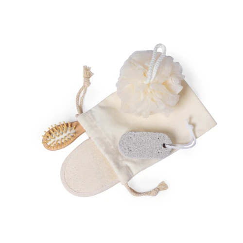 Completo set de baño con 4 accesorios. Practica bolsa de algodón de autocierre que incluye: cepillo para pelo fabricado en suave madera con cerdas a juego, suave esponja, esponja exfoliante adaptable a la palma de la mano y piedra pómez.