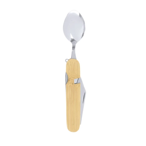 Set de cubiertos multifuncional fabricado en acero inoxidable y bambú. Incluye 7 funciones: cuchara, tenedor, cuchillo, abrebotellas, abrelatas, sacacorchos y punzón.Materiales como el Bambú fomentan la utilización de materias primas naturales reduciendo las emisiones contaminantes. Además, el bambú proviene de una planta de gran resistencia y versatilidad, con crecimiento y regeneración rápida, siendo una excelente alternativa al uso de madera tradicional.