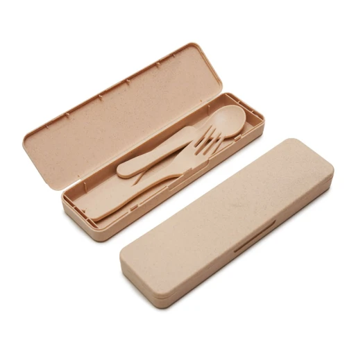 Set de cubiertos de PP y Wheat Straw, pasta de tallo de trigo, un material sustentable que reduce el consumo de plásticos vírgenes. Incluye: tenedor, cuchara, cuchillo y contenedor. Debido a que la pasta de trigo es un material 100% natural, puede haber ligeras variaciones en el color del producto de un lote a otro. ReUseMe