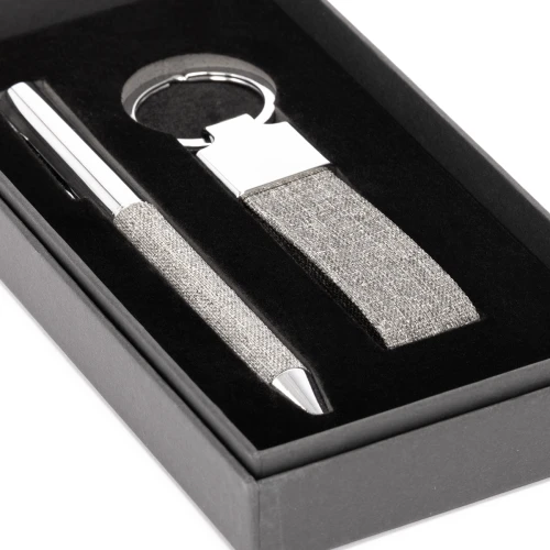 KALANI combina funcionalidad y diseño en un set compuesto por bolígrafo metálico y llavero revestidos en tela RPET gris. Cada elemento está cuidadosamente empacado en una caja negra que proyecta sobriedad y profesionalismo. El RPET proviene de botellas recicladas, dándole una segunda vida al plástico y reforzando el mensaje de cambio desde lo cotidiano. Coloca tu logo y convierte este set en una expresión tangible del compromiso de tu marca con un futuro responsable.