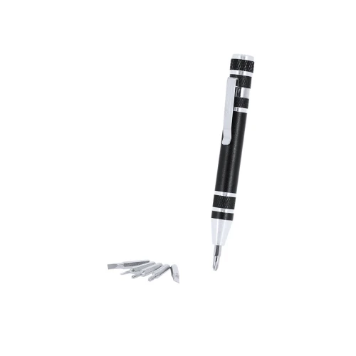 Set de Herramientas Multifuncional con Linterna y Destornillador en aluminio. Incluye:- Destornillador con 6 cabezales imantados: 3 planos y 3 de estrella, equipado con un práctico clip metálico que facilita su enganche y transporte.- Linterna LED con 9 LEDs, alimentada por 3 pilas AAA (no incluidas). Incorpora cordón para muñeca, ofreciendo comodidad y seguridad en su manejo.Presentado en caja negra.