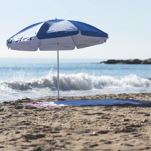 Sombrilla de playa de 8 paneles en resistente nylon. Interior en color gris plateado con protección UV, con tubo telescópico inclinable y ajustable en altura. 200cm de diámetro, con faldones laterales ribeteados, tubos metalizados en color blanco y disponible en una amplia gama de colores. Presentada en funda de nylon con cinta de transporte para hombro.