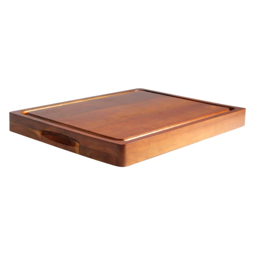 Gruesa tabla de madera sólida de ACACIA, para uso por ambos lados. Un lado con canaleta para cortar carnes y pescados, el otro lado con compartimento para poner verduras picadas, frutos secos o picoteo. Ideal para verduras y/o selección de quesos. Contiene ranuras laterales para tomar la tabla con mayor facilidad. Madera trabajada y acabada en máquina, de forma 100% regular, con superficies, laterales y cantos lisos y suaves, para una mayor higiene y comodidad al momento de cortar y servir alimentos. La Acacia, junto con la Teca, es considerada la mejor, más dura y más resistente madera para utilizar para cortes de alimentos - Densidad aprox. 770kg/m3. - Dureza 9.5 (test de Monnin).