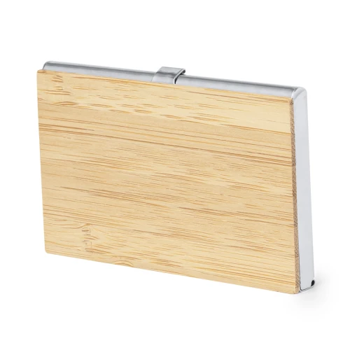 Elegante tarjetero fabricado en suave bambú, con tapas duras y cierre de presión. Destaca el detalle de bambú en la parte frontal y cuenta con un compartimento interior para almacenar tarjetas. Presentado en una bolsa individual de papel reciclado.Materiales como el bambú fomentan la utilización de materias primas naturales, reduciendo las emisiones contaminantes. Proviene de una planta de gran resistencia y versatilidad, con crecimiento y regeneración rápidos, siendo una excelente alternativa al uso de madera tradicional.