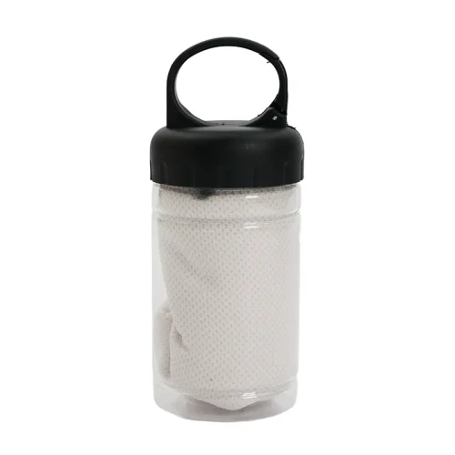 Toalla con estuche portátil. Fabricada en poliéster, PET y polipropileno. Cuenta con toalla de secado rápido (30 × 80 cm) y envase plástico con gancho incorporado para colgar o transportar fácilmente. Es ideal para entrenamientos, actividades al aire libre o viajes, gracias a su tamaño compacto y capacidad de secado rápido.