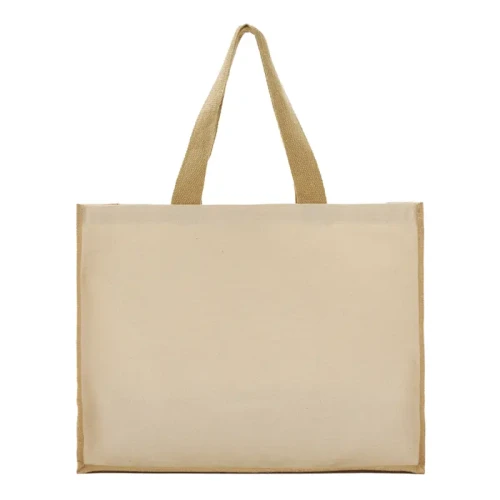 Tote bag fabricada en canvas de 320gsm (10 oz) combinada con yute laminado. Ideal para quienes buscan una bolsa amplia y resistente para transportar compras, libros u otros objetos de forma práctica y ecológica. Medidas: 35 x 46 x 19 cm. ReUseMe