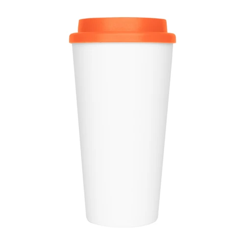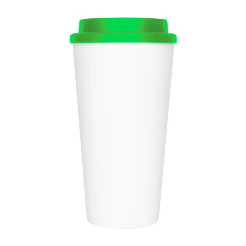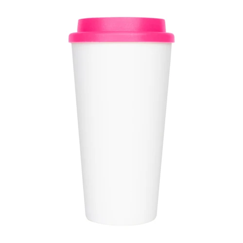 Vaso de polipropileno (PP) blanco doble pared, para líquidos fríos y tibios, con tapa rosca de color. Cuerpo cónico liso, para amplia impresión de logo. Producto BPA FREE, para el contacto con líquidos y alimentos. Capacidad 500ml. Presentación en caja de cartón color blanco.