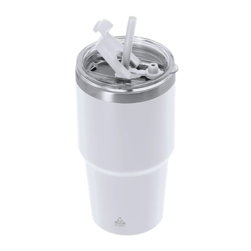 Vaso térmico fabricado en acero inox reciclado de doble pared y 650 ml de capacidad. Cuenta con doble sistema de bebida: orificio con cierre hermético y pajita integrada, adaptándose a las preferencias de uso. Cuenta con tapón para cierre hermético cuando se extrae la pajita. Es ideal para tener en tu escritorio, mesa o en cualquier superficie donde disfrutar tranquilamente de tu bebida favorita. Con logotipo Acero Inox Reciclado.